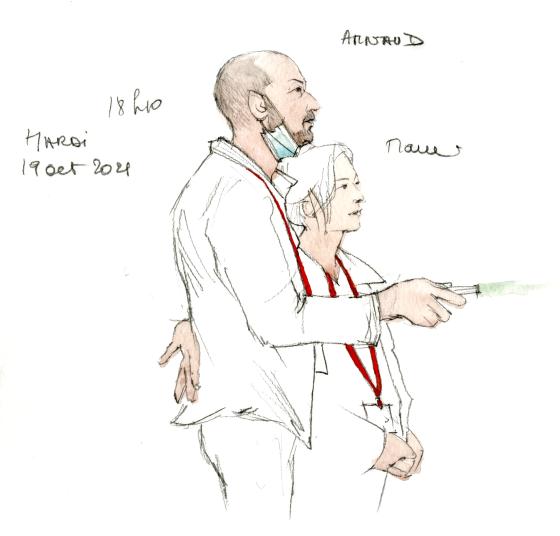 Dessin à l’aquarelle de Noëlle Herrenschmidt représentant François Giroud et Aurélie Silvestre lors du procès, le jeudi 21 octobre 2021