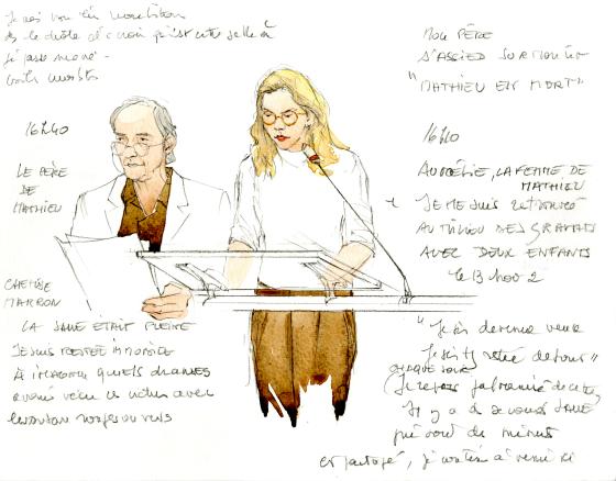 Ce dessin représente les dépositions d’Aurélie Silvestre et de François Giroud, la compagne et le père d’une victime de l’attentat du Bataclan, Matthieu Giroud, enseignant en géographie à l’université. Leurs témoignages, parmi les 350 parties civiles entendues, marquent l’audience, ce jeudi 21 octobre 2021. Dès 2016, Aurélie Silvestre, enceinte de cinq mois à l’époque des attentats, a témoigné, dans un livre, Nos 14 novembre, du traumatisme vécu par les proches des victimes. Les annotations prises par Noëlle Herrenschmidt témoignent de cette sidération dont elle fait part au procès (« Mon père s’assied sur mon lit : "Mathieu est mort" »), mais aussi du chemin de reconstruction entrepris avec ses deux enfants et son nouveau compagnon dans l’après-13 Novembre. La représentation, volontiers sobre, des deux témoins montre la minutieuse préparation des parties civiles via la lecture de textes depuis le pupitre de la salle d’audience – le tapuscrit publié en ligne de la déposition d’Aurélie Silvestre est considéré comme un autre moment marquant du procès V13. La déposition du père de Matthieu Giroud, ici représenté avec ses lunettes de vue, évoque tous ces traumas vécus par les proches des victimes, mais également la nécessité de témoigner au procès, un « devoir social », dira-t-il aux journalistes. Ces dépositions sont l’occasion pour les victimes et ces proches de renforcer cette communauté de destin – et de deuil – constituée depuis les attentats et de s’inscrire dans une mémoire collective (« Je suis restée immobile à imaginer quels drames avaient vécu les victimes avec les rubans rouges ou verts », la première couleur interdisant à la presse de leur poser des questions, la seconde l’autorisant).