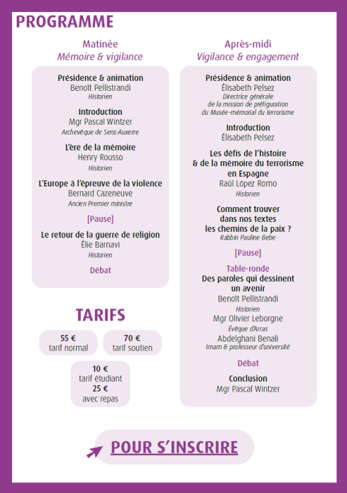 Mgr Pascal Wintzer, archevêque de Sens-Auxerre, responsable de l'Observatoire Foi & Culture (OFC) de la CEF, vous convie vendredi 12 décembre prochain à partir de 9h30, à la Conférence des évêques de France (CEF) à Paris, au colloque annuel de l'OFC, en partenariat cette année avec le Musée-mémorial du terrorisme qui participe à l’œuvre de mémoire due aux victimes et au service de la Nation que les attentats ont visée ou atteinte, mais aussi provoquée et mobilisée.