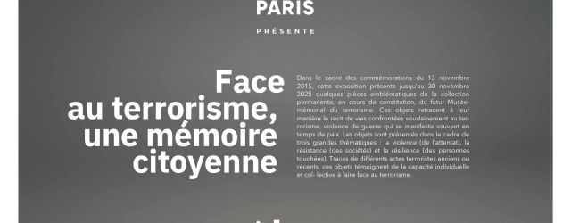 Cette exposition s’inscrit dans une séquence nationale de mémoire et de mobilisation. Elle accompagne le développement du Musée-mémorial du terrorisme en présentant pour la première fois au grand public une partie de ses futures collections permanentes. Elle présente des dons de victimes, de proches de victimes et d’institutions impliquées dans la lutte contre le terrorisme, ainsi qu’un scellé judiciaire d’une affaire définitivement jugée. Loin de se limiter à l’entretien du souvenir, mémoire individuelle et mémoire collective se rejoignent dans un engagement citoyen, qui témoigne de la résistance et de la résilience de nos sociétés.